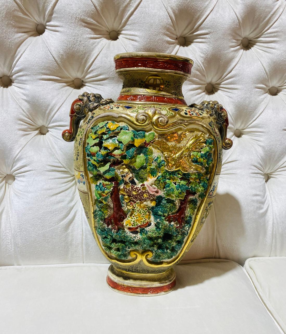 Антикварная ваза Сацума, выполнена в технике кракле. Фарфор, роспись эмалевыми, золотой краской. Надглазурная и подглазурная роспись. Ручки вазы выполнены в виде драконов. Дракон - это один из самых важных символов в азиатской культуре, символ власти и мудрости.