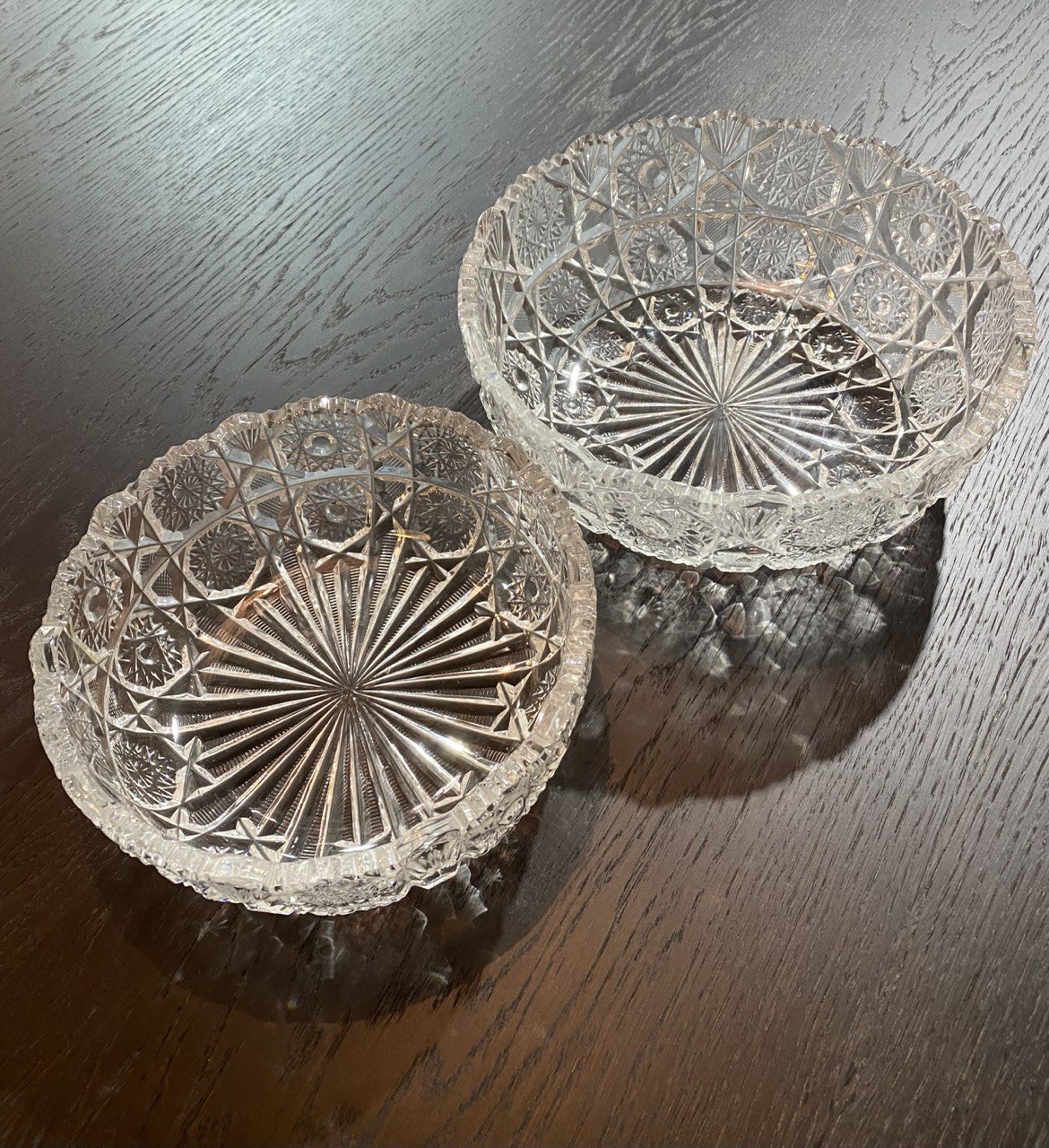 Kрасивыe хрустальныe винтажные вазы для фpуктов и конфeт "Cнежинкa" играют всеми своими изящными алмазными гранями при любом освещении подобно драгоценным камням и по достоинству украсят любой праздничный стол. Витринное хранение.