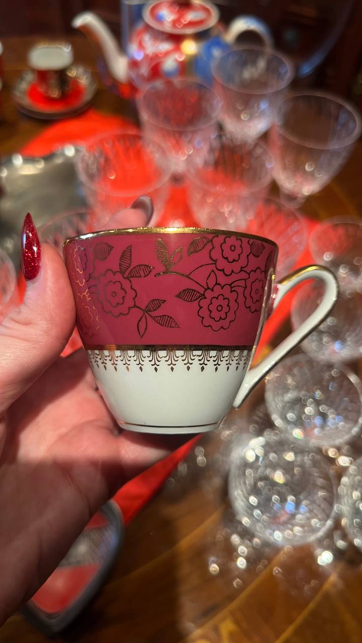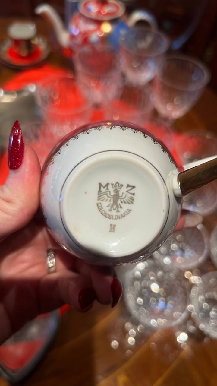 Сервиз кофейный на 12 персон, украшенный золотыми цветами по малиновому фону, фарфор, деколь, крытье, золочение, Moritz Zdekauer (MZ), Чехословакия, 1945-1970 гг.