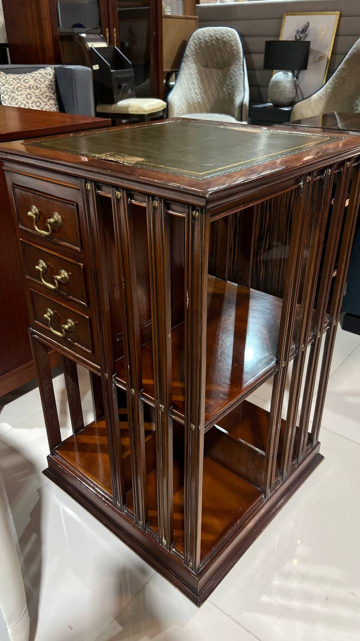 Вращающийся книжный стеллаж из красного дерева в английском стиле от Niagara Furniture имеет столешницу из натуральной кожи с декоративной окантовкой, три выдвижных ящика с соединением «ласточкин хвост» и множество поддерживающих отделений для хранения, все это украшено латунными винтами и фурнитурой. Весь предмет установлен на механизме, позволяющем вращать его одним движением пальца. Один из самых оригинальных предметов в коллекции мебели Niagara, прекрасное дополнение к любому дому.