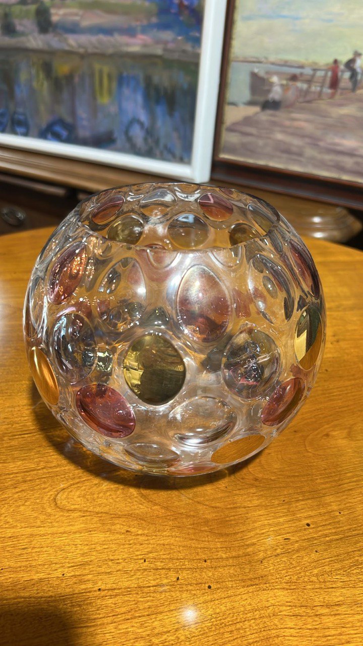 Ваза имеет узнаваемую шарообразную форму с декором в виде «чечевиц» или «монет». Эти углубления создают оптический эффект за счет игры света.
