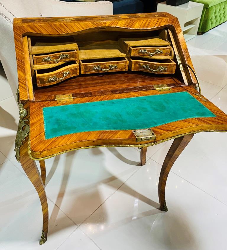 Антикварное бюро в стиле Людовика XV. Выполнено из дуба и розового дерева в технике маркетри. Декорировано бронзовыми накладками с растительным мотивом. Ножки - кабриоли выполнены в характерном стиле. Бюро оснащено откидной столешницей, пятью выдвижными ящичками. Середина ХIX века, Европа.