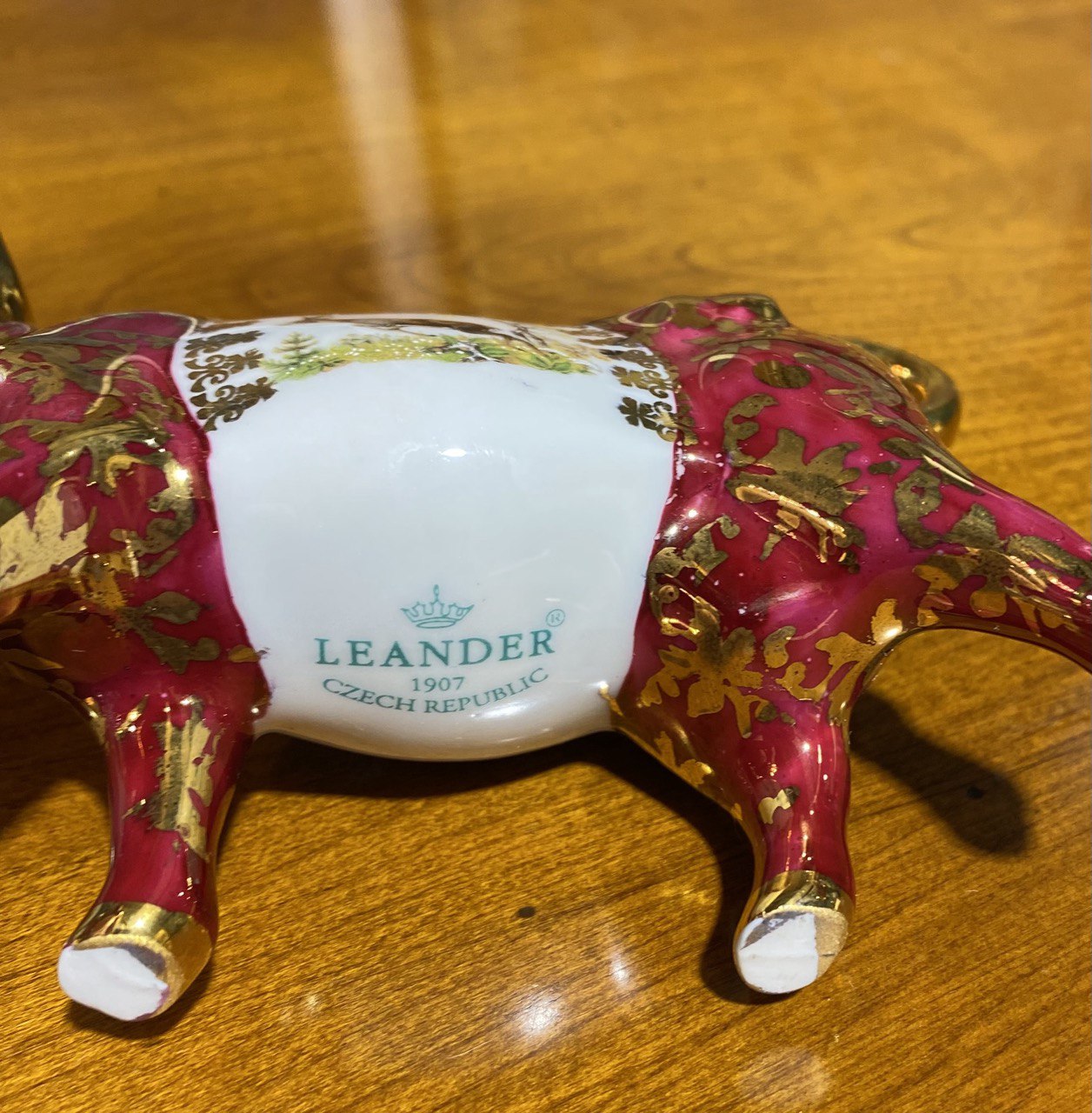 На боку изделия расположена вставка с изображением оленя, а сама фигурка украшена богатым золотым растительным орнаментом на красном фоне.