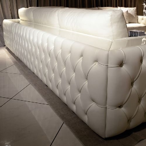Каркас из древесины тополя и пихты. Обивка - кожа), украшена мебельной стежкой капитоне. Наполнитель: пенополиуретан, перо, акрил.