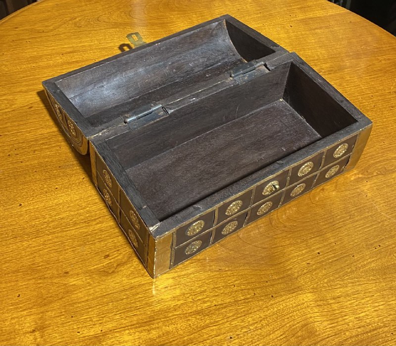 Шкатулка изготовлена из темного дерева и украшена накладками из латуни.